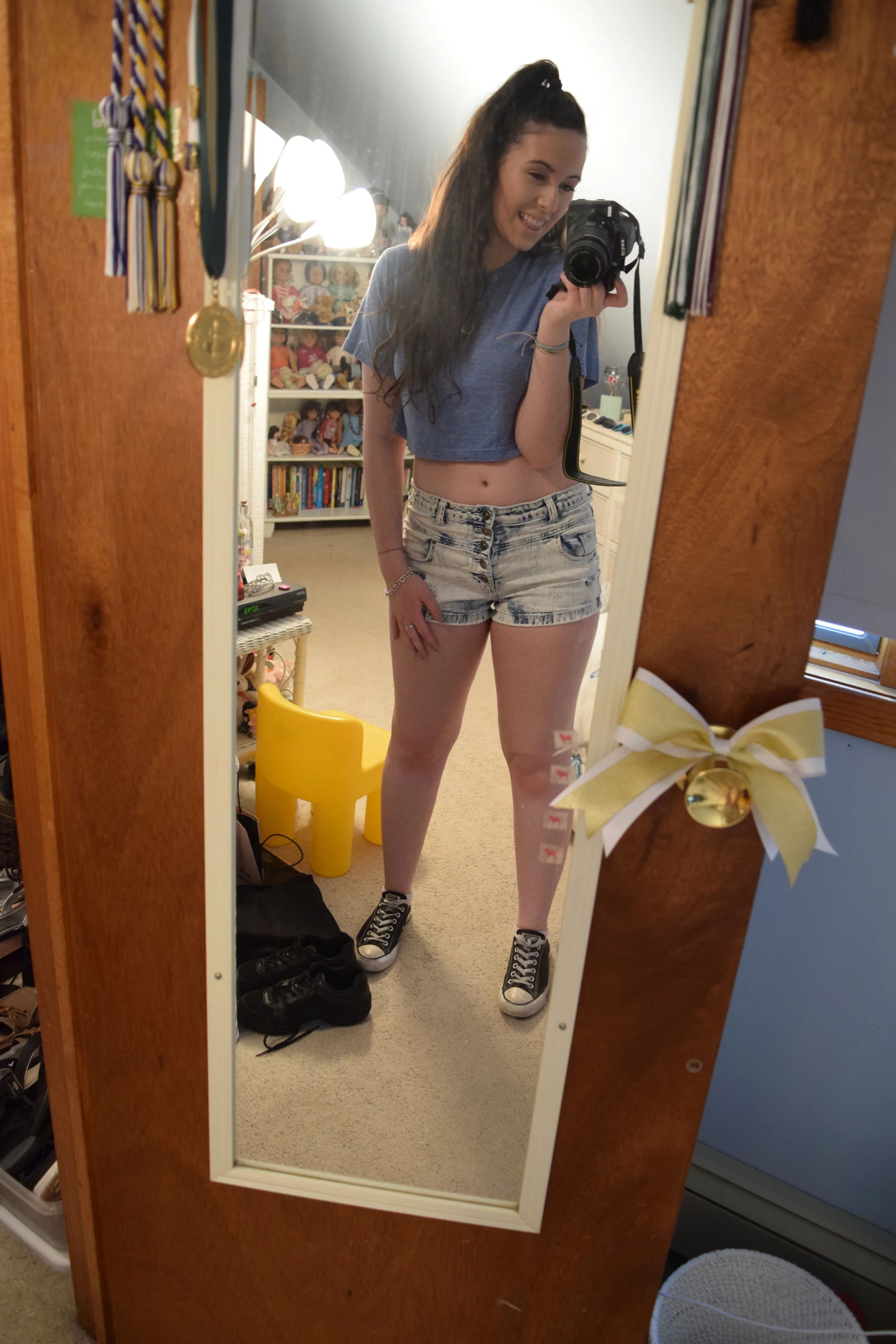This shirt is another one of my cousin’s hand-me-downs that I absolutely love. It’s super soft and comfy but adorable! I chose to wear a crop top since it was super hot today and I was doing a lot of walking. I also wore my high waisted blue shorts since they looked really cute with the top. As always, I had the black vs. white Converse dilemma, and black just looked better.